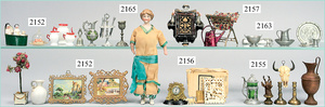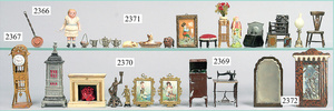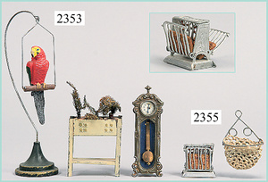 dollhouse decoration parts, small clock, 8.5 cm, flower bench, 1 parrot, ELASTOLIN, mass