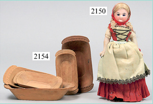 dollhouse doll, housekeeper, 15.5 cm, bisque shoulder headed doll, arms and legs, fabric body, original clothes/underwear, with small all-bisque child