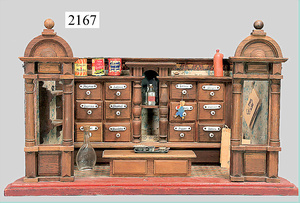BOULE, top cabinet for a dollhouse, down below 2 drawers (are jammed tight), upper door is mirrored, 1 hinge is loosely, lithography in good condition, 17 cm