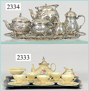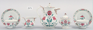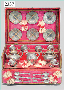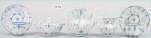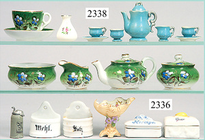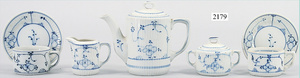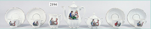 doll's coffee service, porcelain, design blue/red, coffee pot 11.5 cm, sugar bowl, milk can, 6 cups and saucers, 1 bowl, some cutlery parts, handle blue/white, porcelain, excpet of small hairline cracks in good condition