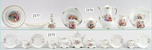 RAUENSTEIN, doll's dinner service, 6 flat plates, 6 soup plates, 6 dessert plates, dishes, sauce boat, tureen, plates with a diameter of 14 cm