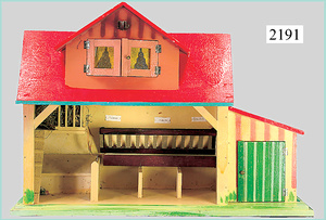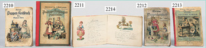 dollhouse, c. 1890, height 97 cm, width 83 cm, depth 56 cm, staircase, and 3 rooms, probably Hacker, inside with old wallpapers, wall and floor, kitchen with up painted tile pattern, wallpaper in the kitchen is probably more recent, very nice ceiling painting in both upper rooms, with glued on picture, front inside can be open, partially old up painted brick pattern, was painted over in the white area, very decorative