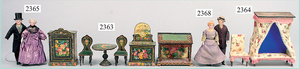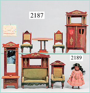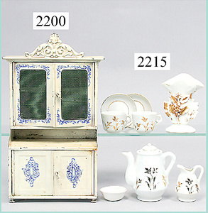 dollhouse furniture program, with lithographed flower decor, cupboard 10.5 cm, chest of drawers 11 cm, circular table, 3 chairs, 1 writing desk, unusual for a small high-quality room or for a dollhouse
