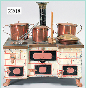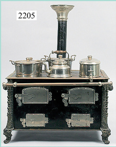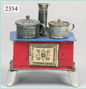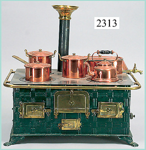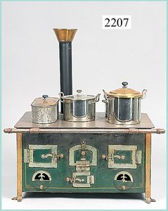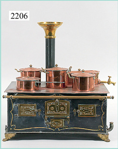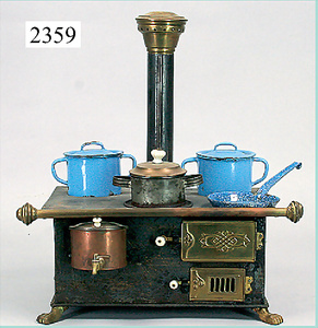 dollhouse stove, around 1900, 33 cm wide, doors, handle and lion's paw feet are made of brass, 1 built-in kettle, with drain valve, 1 pot and funnel are original, 2 pots made of enameled tin were supplemented
