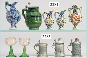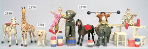 SCHOENHUT, Humpty-Dumpty, large series, donkey, 25 cm, elephant, 22 cm, point of trunk is missing, 1 elephant, 20 cm, with glass eyes, 2 clown figures, 1 August, small series, accessories, chairs, table, ladders, barrels, weight