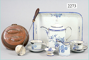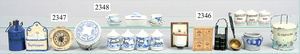 mixed lot of doll kitchen parts, porcelain, blue / white, herring tin, 5 cm, 4 spice doses, cover original ? 2 cups with saucer