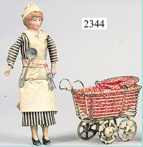 dollhouse doll, housekeeper, bisque shoulder headed doll, with exceptional hairstyle, bisque arms and legs, fabric body, original clothes and underwear, 12.5 cm