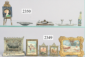 dollhouse decoration parts, chimney / tin, tin, 7 cm, a picture gilded brass/tin frame, 2 small pictures with tin frames