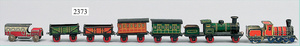 Penny Toy, toy, lithographed tin, '20s, 2 locomotives, 7 and 8.5 cm, 2 passenger coaches, 1 freight waggon, 1 truck, 5 cm, for a toy shop or a Christmas scene in a dollhouse