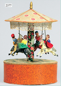 small roundabout, height 27 cm, wood/cardboard, stuck with paper, fabric sky, 4 jumping mass horses with figures, crank drive with music mechanism, nice size