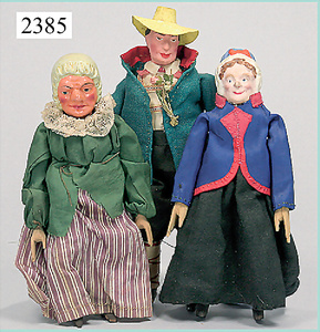 3 parts dollhouse theatre dolls, 16 cm - 17.5 cm, 2 grandmothers, 1 man, man with knocked tiptoe, head is loosely add, head papier mâché, jointed wood body, old clothes