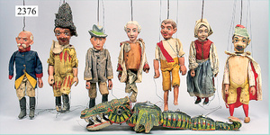 7 marionettes, wood/mass, c. 1910, 26 cm, feet are partially knocked, 1 figure without legs, with 1 crocodile, wood, 54.5 cm