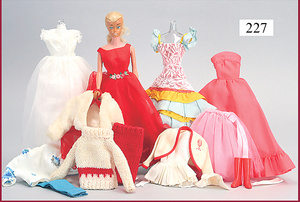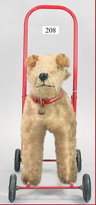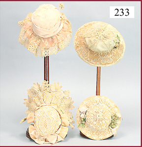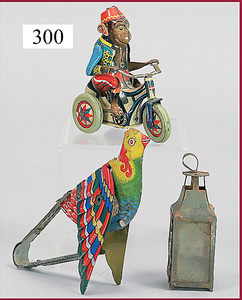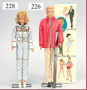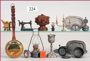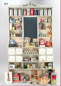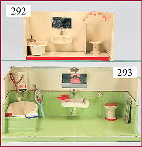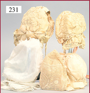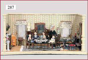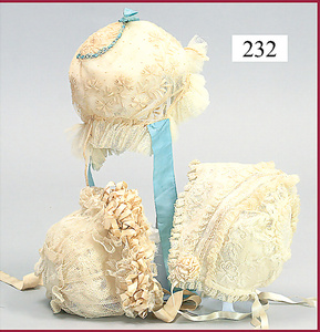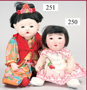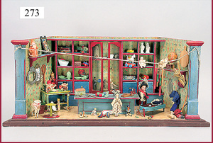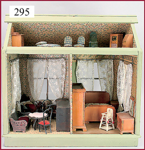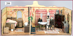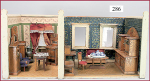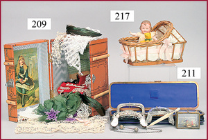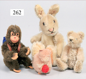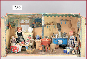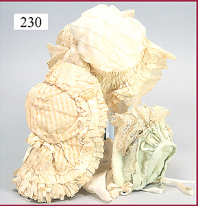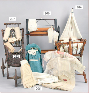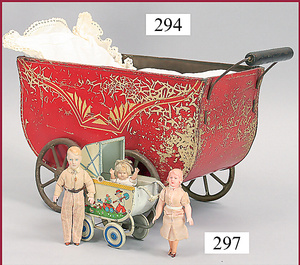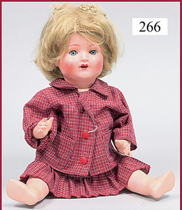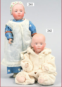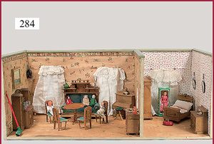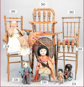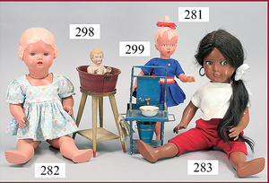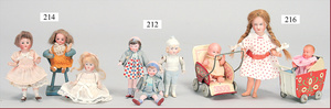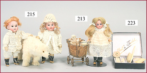 3 Puppenstuben-Püppchen, Porzellan, 1 x gemarkt K & R, braune fest eingesetzte Glasaugen, Echthaar-Perücke aufgeklebt, anmodellierte Schuhe u. Strümpfe, 11 cm, 1 x gemalte Augen, Mohair-Perücke aufgeklebt, anmodellierte Schuhe u. Strümpfe, 10 cm, 1x ungemarkt, braune fest eingesetzte Glasaugen, geschl. Mund, Mohair-Perücke, Masse-Körper, anmodellierte Schuhe u. Strümpfe, 11,5 cm, in einem kl. Holzhochstuhl