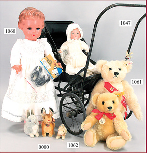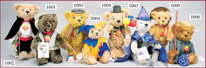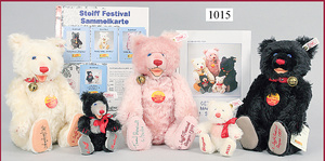 STEIFF Konv. 5 Teddybabys, Festival-Bären, Giengen, 1997-2000, 2 x 12 cm und 3 x 28 cm, mit Festival-Sammelkarte und Zertifikat, dazu 1 Buch, 150. Geburtstag von Margarete Steiff