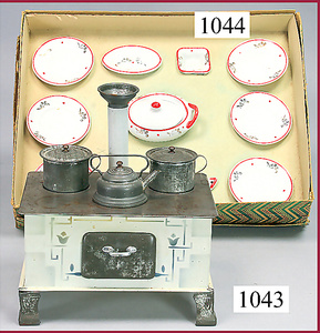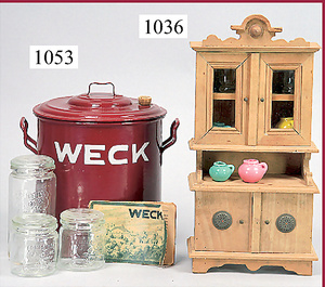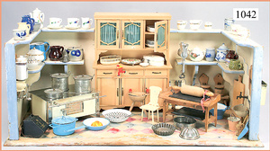 Puppenküchenschrank, Holz, 4-türig, 2 Türen davon verglast, 2 Schubladen, Höhe 48 cm, dazu 3 Teile Keramik