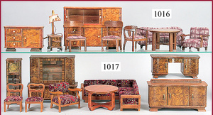 Puppenstuben-Wohnzimmer Möbelprogramm, Holz, 30er Jahre, mit Buffet, Standuhr, Sekretär, Sideboard, Sofa, zwei Stühle, Sessel und Tisch