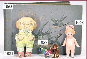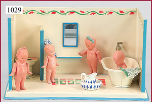 Blech-Badezimmer, Länge, 24 cm, mit Badewanne u. Toilette, dazu 4 Celluloid-Püppchen, teilw. Verformt