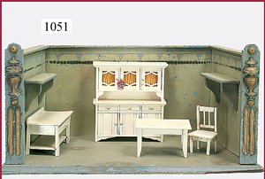 Puppenstuben, Wohnzimmermobiliar, Holz, 30er Jahre, mit Buffett, Tisch, Sofa, drei Stühle ein Sessel eine Stehlampe und ein Sideboard
