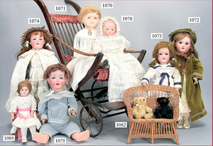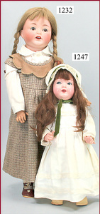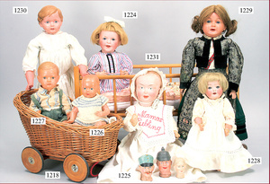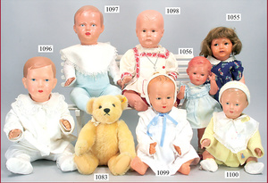 HEUBACH, KÖPPELSDORF Masse-Puppe, gemarkt 342.1 Germany, 45 cm, braune Schlafaugen, off. Mund, Zähne, Echthaarperücke aufgeklebt, (Bitte Transportrisiko der Augen beachten), auf Masse-Stehbabykörper, bespielt, minim. Farbabrieb an den Wangen