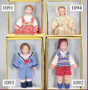 4 Puppenstubenpuppen, Masse, bewegl. Glieder, Füße Guss, ca. 14,5 cm