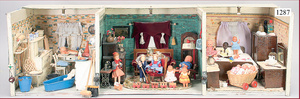 3-teilige Puppenstube, Holz, mit elektr. Leitungen für Lichtanschluß, kompl. möbliert, mit Küche, Wohnzimmer und Schlafzimmer, Holzmobiliar, schön gearbeitet, 3 Fenster verglast, Länge 1,03 m, Tiefe 35 cm, Höhe 30 cm