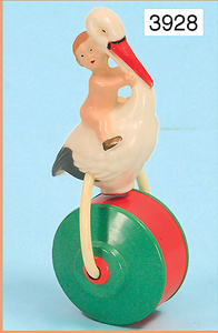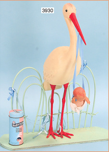 50er Jahre, Werbeaufsteller, für Baby-Puder, 58 cm hoch, Storch, wohl Celluloid, mit kl. Vinyl-Puppe, ausgef.