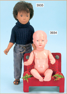 Pianobaby, gemarkt Made in Germany, 12304, 23 cm, anmodellierte Kleidung, mit kleinem Biskuithasen, spielend
