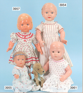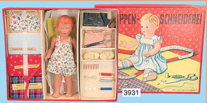 "Die Puppenschneiderei", Otto Meier Ravensburg, mit Schnittmusterbogen, Stoffen, Nähgarn, Knöpfen u. Zubeh., dazu Schildkröt Tortulon-Puppe, neuwertig, Orig.-Karton