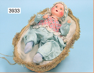 Wachs überzogenes Pappmachékopf-Baby, im Korbkinderwagen, ca. 1890, wohl Sonneberg, 19 cm, Puppe hebt sich, bewegt Arme und Beine, fest eingesetzte Glasaugen, Drahtkörper mit Masse-Armen und -Beinen, altersbed. Spannungsrisse im Gesicht, ausgef.
