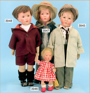 KÄTHE KURUSE Deutsches Kind, Friedebald, Puppe Nr. IX, 36 cm, ca. 1930, Stoffkopf, deutlich sichtbare Hinterkopfnaht, leicht eingeknickte Beine, in den Kniekehlen abgenäht, alte Unterkleidung, Mantel, Hose und Schuhe neuer, sehr guter Orig.-Zust.