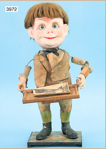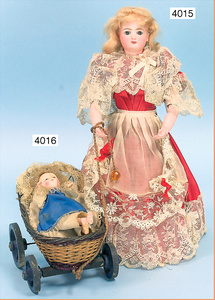 Halbautomat, Laufpuppe, Walking Steiner, ca. 1890, 39 cm, Biskuit-Kurbelkopf, blaue fest eingesetzte Glasaugen, off. Mund, Zähne, Biskuit-Brustblatt-Pappmaché-Körper, mit Uhrwerk, Puppe läuft und hebt die Arme, Arme gegliedert, Unterarm Biskuit-Porzellan, mit fein ausmodellierten Fingern, alte Mohairperücke mit Orig.-Pappmachédeckel, Orig.-Kleidung, ausdrucksstark