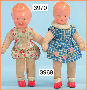 Konv. 3 Puppen, Nr. 1 SoR, Celluloid, Junge, 16 cm, fester Kopf, stark ausmodellierte Haare, gemalte Augen, geschl. Mund, anmodellierte Schuhe und Strümpfe, 1 Stuben-Puppe, Celluloid, Brustblattkopf, ohne Raute, Masse-Stehkörper, 14,5 cm, 1 kl. Celluloid-Mädchen, Celba, einige Kleidungsstücke