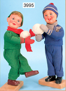 Schneekinder, 35 cm, wohl 30er Jahre, Pappmachéköpfe, Masse-Drahtkörper mit fest aufgenähter Filzkleidung, wohl Schaufensterdekoration, ausgefallen, schöner Orig.-Zust.