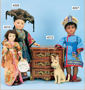 Burmesin, ungemarkt, 32 cm, Biskuitkurbelkopf, braune, fest eingesetzte Glasaugen, off. Mund, oben Zähne, Masse-Stehkörper, mit beweglichen Armen und Beinen, alte Kleidung, altersbedingt verschlissen