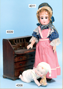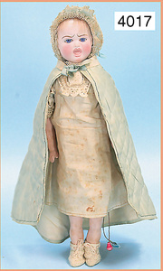 Ganzbiskuitpuppe, gemarkt 161, 13 cm, fester Kopf, braune, fest eingesetzte Glasaugen, geschl. Mund, bewegl. Arme u. Beine, aufgemalt. Schuhe u. Strümpfe, orig. Seidenkleid, Mohairperücke fest aufgeklebt, wurde nicht entf.