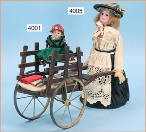 Puppenautomat, Laufpuppe mit Wagen, 34 cm Länge, 30 cm Höhe, Biskuit-Porzellankopf, geklebt, Uhrwerk intakt, alte Kleidung