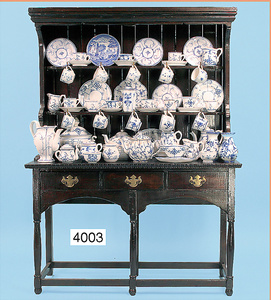 Puppengeschirrschrank, 90 cm Höhe, 65 cm Breite, unten 3 Schubladen, um 1900, ca. 50 Teile Porzellan, blau/weiß, Tassen, Teller, Krüge, Kannen
