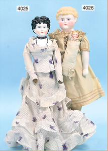 BIEDERMEIER Parian, 46 cm, Biskuitbrustblattkopf, fein ausmodellierte Haare, ausmodellierte Ohren, blaue gemalte Augen, geschl. Mund, Stoffkörper, Biskuitarme/-beine, Fingerspitzen an einer Hand bestoßen, anmodellierte Strümpfe, anmodellierte Schuhe mit Absatz, ein Schuh beschädigt (teilw. geklebt), alte Kleidung, mit Wickelkind