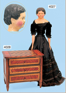 BIEDERMEIER Puppe, Pappmaché, Brustblattkopf, braune gemalte Augen, geschl. Mund, ausmodellierte Haare, leicht angedeutete Ohren, Lederkörper, Holzarme/-beine, altersbed. Spannungsrisse, Krakeleebildung, ca. 1860, museal, erste Fassung