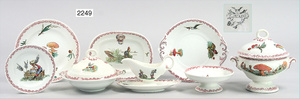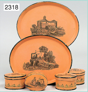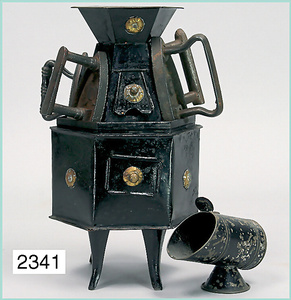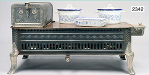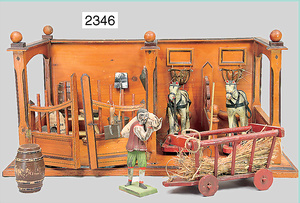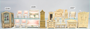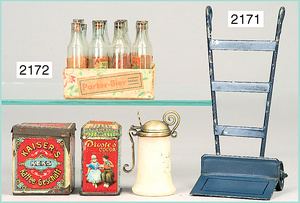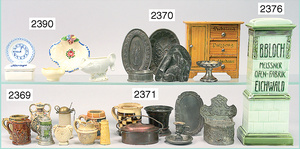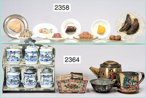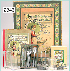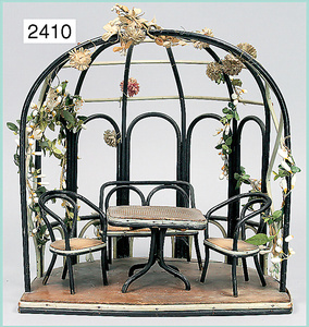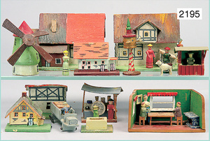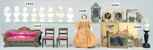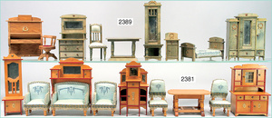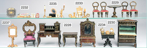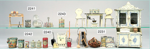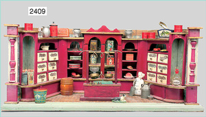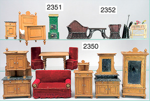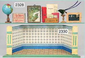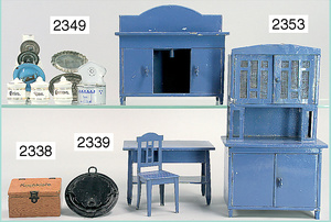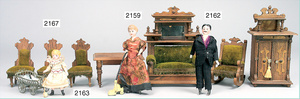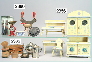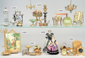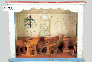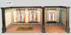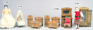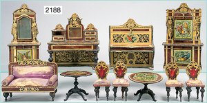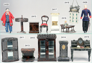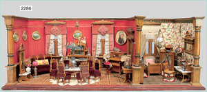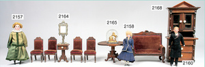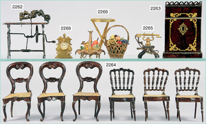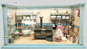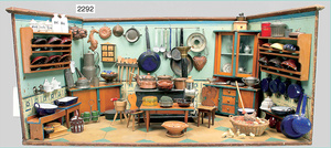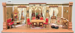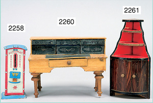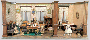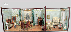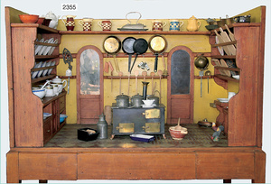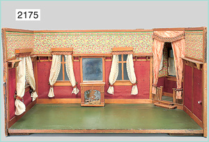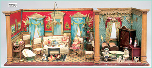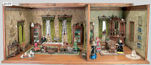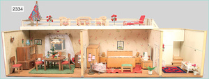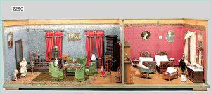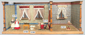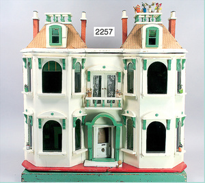 Puppenhaus, ca. 1860, England, 1,25 m breit, 95 cm hoch, 44 cm tief, Orig.-Außenbemalung, Fassade zum Öffnen,Treppenaufgang, Küche, 3 Zimmer mit jeweils fest eingebauten Kaminen, Tapeten teilweise neuer, schöne Deckenbemalung, hochwertig möbliert, reichhaltig Zubehör, Leuchter Messingblech vergoldet, Zinn oder Holz, frühe Rock & Graner Stühle, Biedermeiermöbel, einige Teile Messingblech vergoldet, Küche mit Kupfer, Messing, Zinn und Holzteilen, museal
