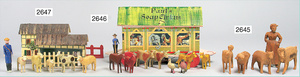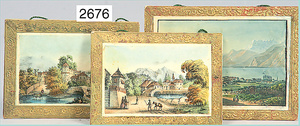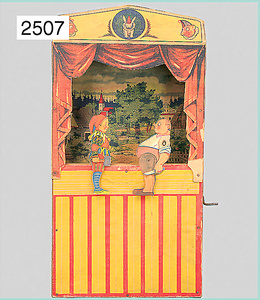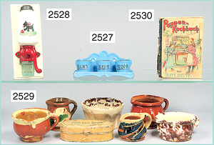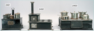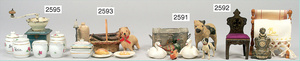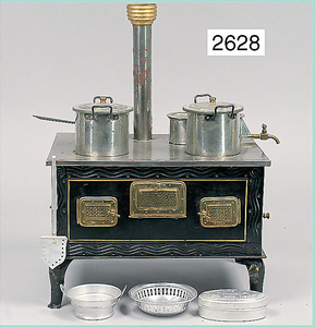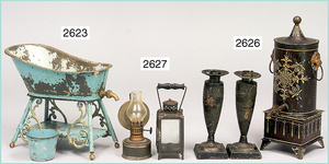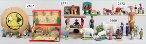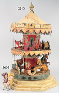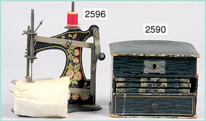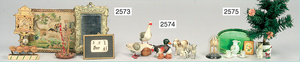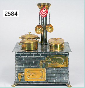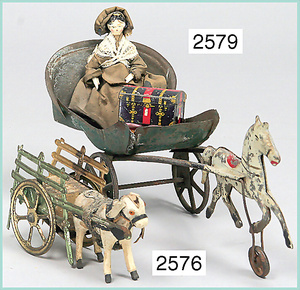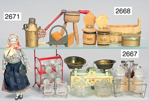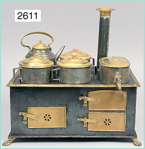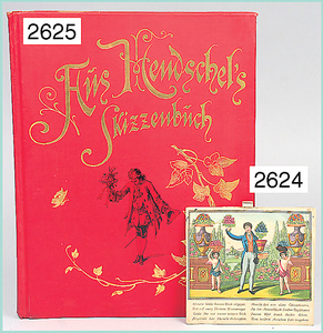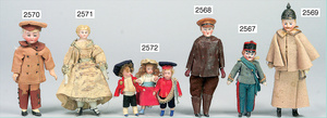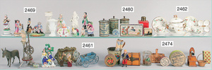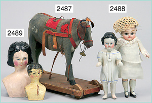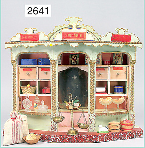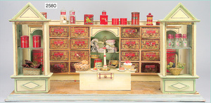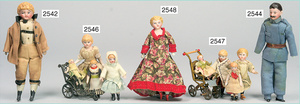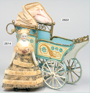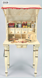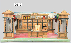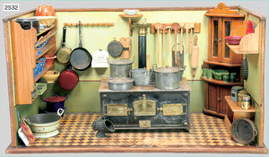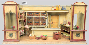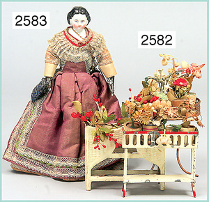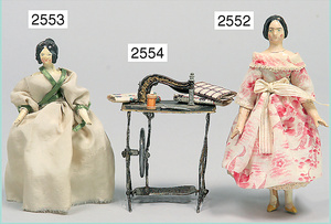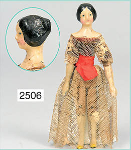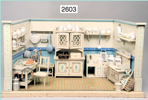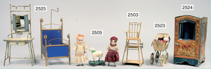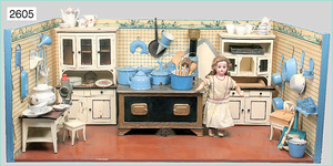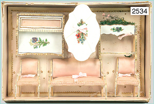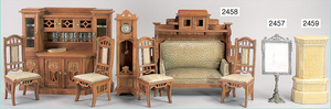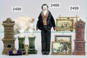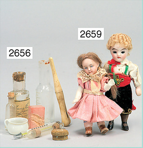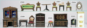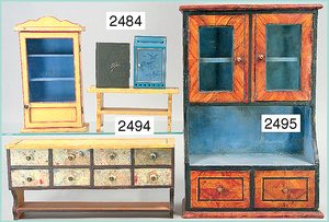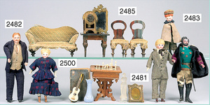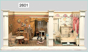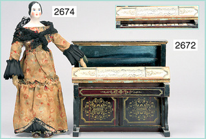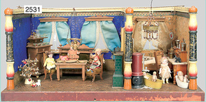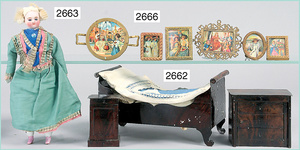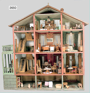 Puppenhaus, ca. 1890, 97 cm hoch, 91 cm breit, 44 cm tief, Fassade mit aufgemalter Eingangstür, Fassade zum Aufschieben, Giebel, ringsum Fenster, schöne Außenbemalung, Orig.-Tapeten, Orig.-Bodenbemalung, 4 Zimmer, mit Durchgangstür, sehr schöner, unberührter Orig.-Zust., Bemalung in sehr guter Erhaltung, möbliert, mit Biedermeier-Möbeln, teils mit Boule-Ornamenten, darunter 2 Vitrinenschränke, 1 Recamiere, Sofa, einige Puppenstuben-Puppen, teils altersb. Fehler an den Möbelteilen (Ecken weggebrochen)