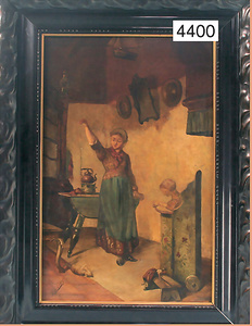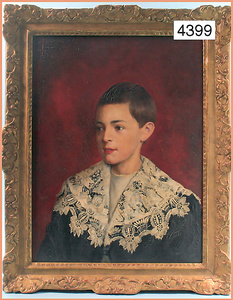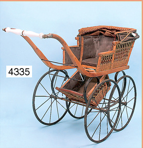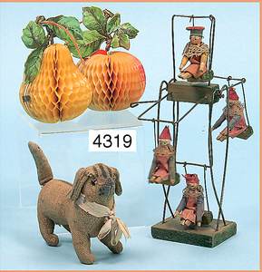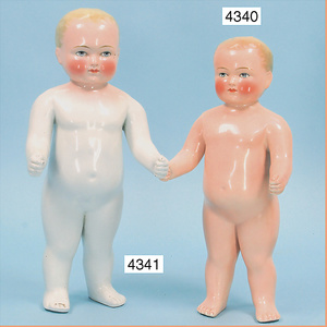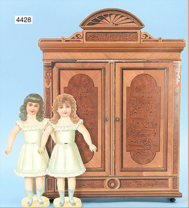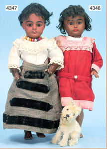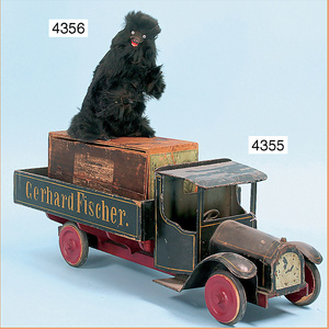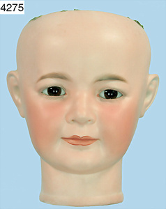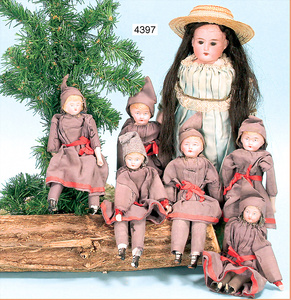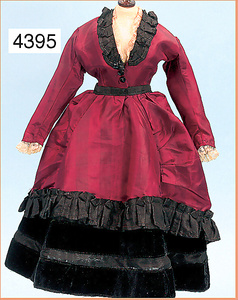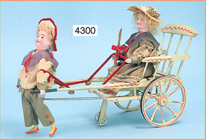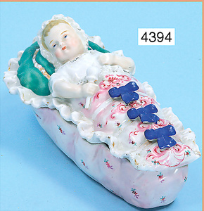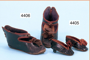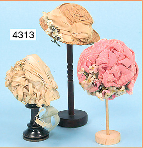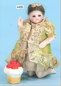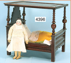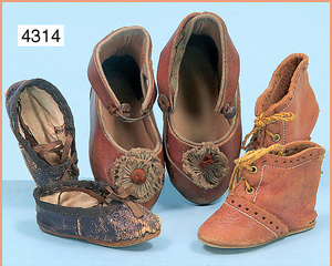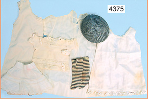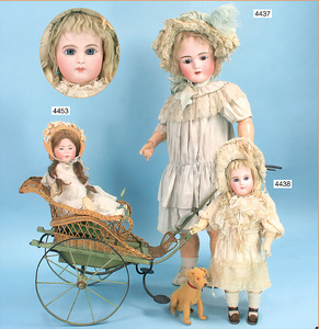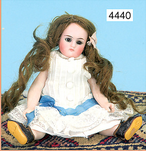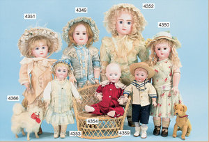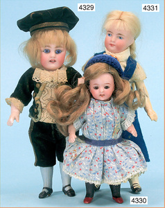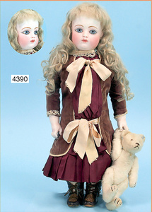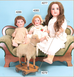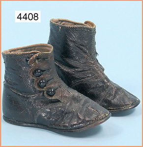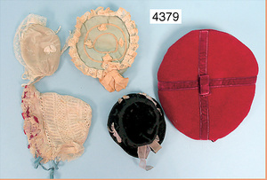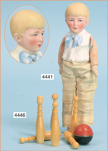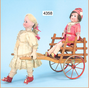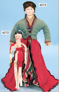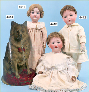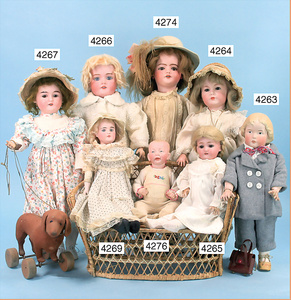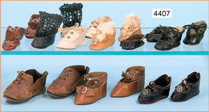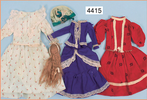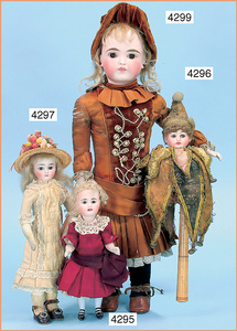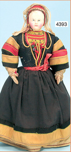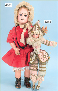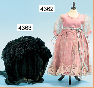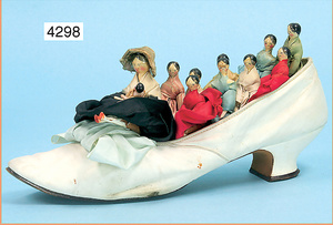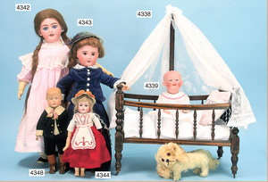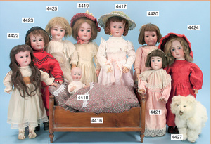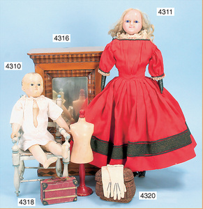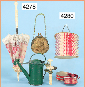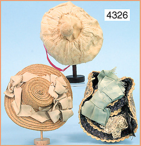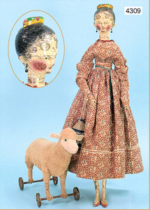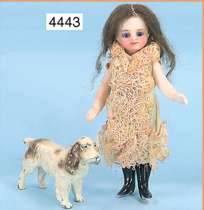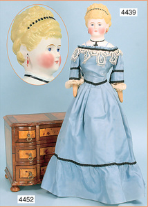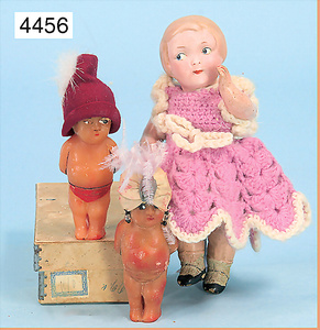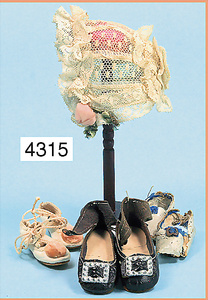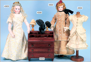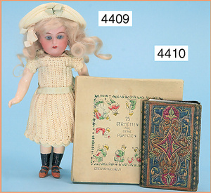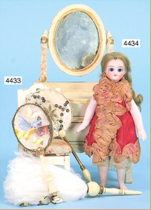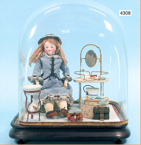 Modepuppe, Frankreich, ungemarkt, 29 cm, Biskuit-Kurbelkopf, blaue festeingesetzte Glasaugen, geschl. Mund, durchstochene Ohren, auf Biskuit-Brustblatt, Lederkörper mit leicht eingeknickten Beinen, separat abgenähte Finger (2 Finger fehlen), alte Kleidung u. Schuhe, dazu passender Hut, Mohairperücke, unter Glassturz, mit zweitem Paar Schuhe, Strümpfe, Tasche, 1 Waschtisch mit Spiegel, Kleinteile
