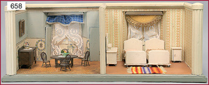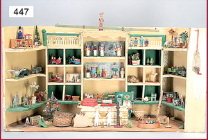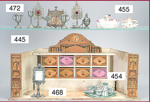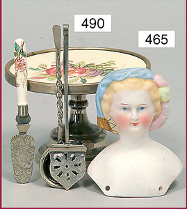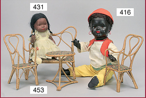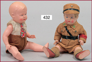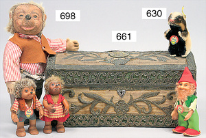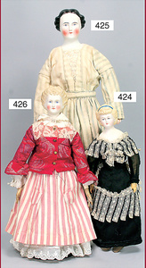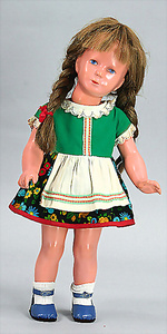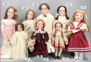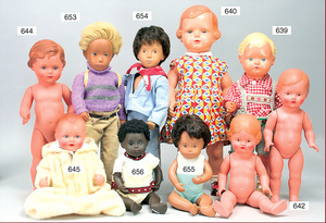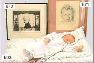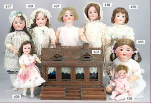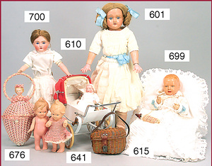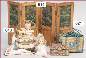 FRANZ SCHMIDT & CO. Porzellan-Kopfpuppe, gemarkt 1272/50, deponiert, blaue Schlafaugen, off. Mund, Zähne, Zunge, Nasenlöcher, Echthaarperücke, fest aufgeklebt, bitte Transportrisiko für den Augenmechanismus beachten, von außen keine Risse erkennbar, Masse-Sitzbaby-Körper, mit abstehendem Zeh, Finger berieben, 48 cm, mit einigen Kleidungsstücken