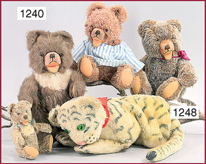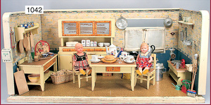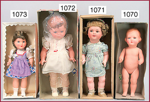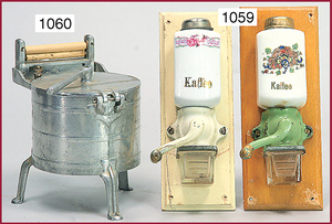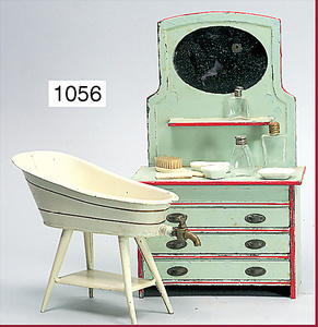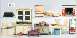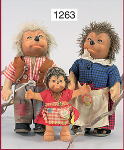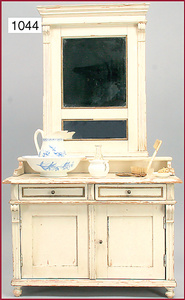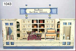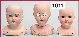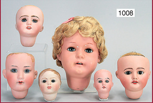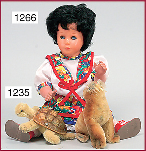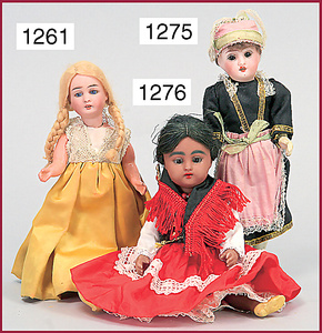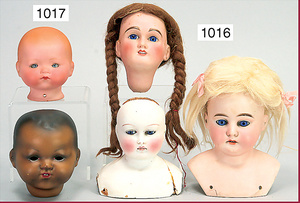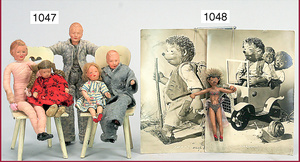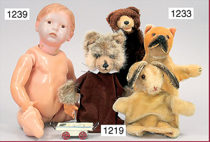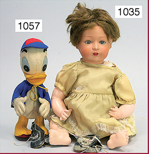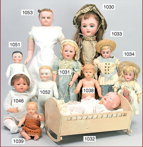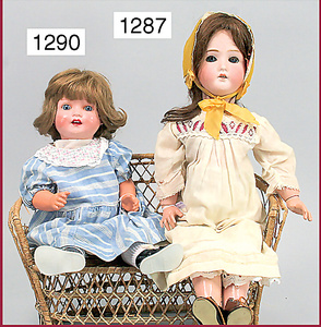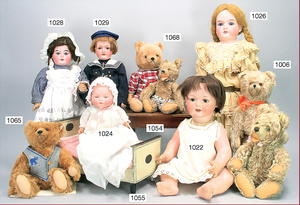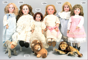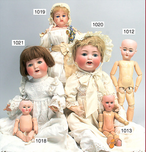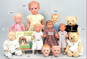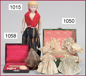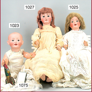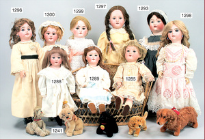 SIMON & HALBIG Porzellankopf-Puppe, gemarkt W.S.K., Riss am Hinterkopf, blaue, fest eingesetzte Glasaugen, off. Mund, Zähne, Mohair-Perücke, aufgeklebt, durchstochene Ohren, Masse-Gliederkörper, bespielt, 1 Bein lose, Finger bestoßen bzw. Daumen weggebrochen, 27 cm, alte Kleidung u. Schuhe, mit kl. Puppenstube-Porzellan-Puppe, Zähne fehlen, 1 Fuß weggebrochen, 10 cm, 1 Oberschenkel ergänzt