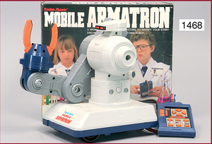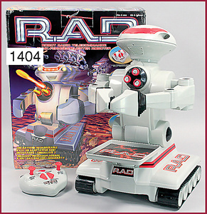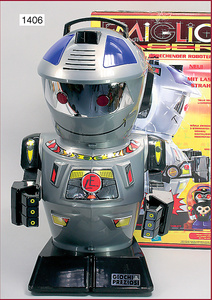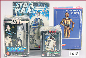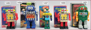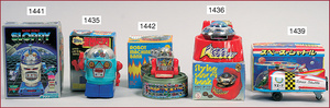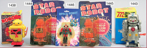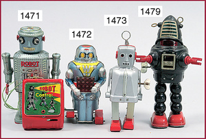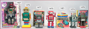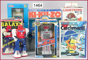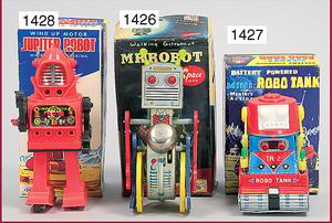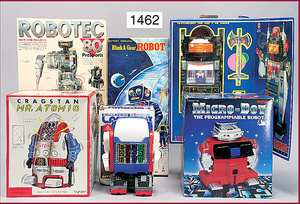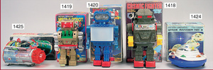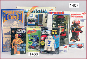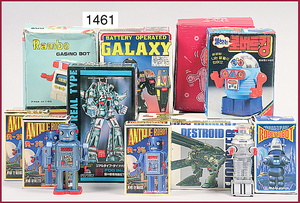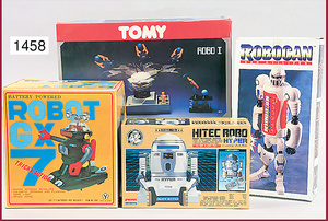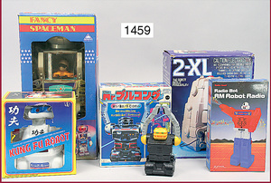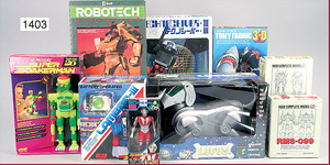 2 Roboter, batteriebetrieben, auf Funktion nicht überprüft, 1 x gemarkt Made in Taiwan, mit Orig.-Kart., Boden fehlt, 1 x Made in Japan, Cleaner u. Sharpener, dazu 1 Leer-Kart., 2 Fernbedienungen, 1 Pistole von Bandai