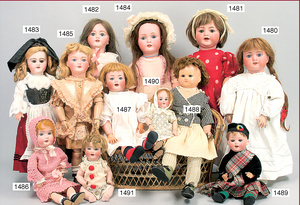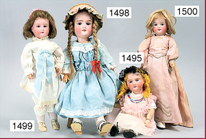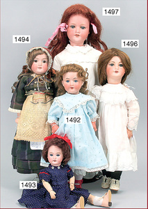 2 Puppen, 1 Porzellankopf-Puppe, gemarkt wohl S & H, braune fest eingesetzte Glasaugen, off. Mund, Zähne, Echthaarperücke, Masse-Stehkörper, mit anmodellierten Schuhen u. Strümpfen, stark bespielt, 18 cm, 1 x S.F.B.J., blaue fest eingesetzte Glasaugen, Echthaarperücke aufgeklebt, Masse-Stehkörper, mit anmodellierten Stiefeln, stark bespielt, 24 cm