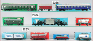 MÄRKLIN 15 Teile Güterwaggons H0, 3x Niederbordwagen, 2-achsig, 1x Tiefladewagen mit Transformator, 1x Kranwagen ,,Krupp Ardelt", 1x Schiebedachwagen, 1x Grossraum-Kesselwagen, 1x gedeckter Güterwagen, mit Schlußlatternen, 1 Containerwagen, 1x Kesselwagen Esso, 1x Kesselwagen Aral, 1x Säure-Behälterwagen, 1x Rugenwagen, 1x Niederbordwagen, mit Ford M 12, Ford fehlt, Klebereste auf der Ladefläche und 1x Niederbordwagen, 4-achsig, alle im Orig.-Kart., guter Zust.