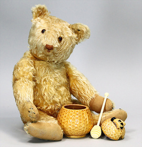 STEIFF Teddybär, ca. 1910, 25 cm, mit Knopf, Schuhknopf-Augen, Filztatzen in gutem Zust., Zimtfarbe stark ausgeblichen, weich gestopft, Mohair an kleineren Stellen am Rücken ausgefallen, sehr schöner Ausdruck