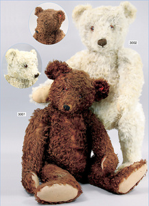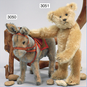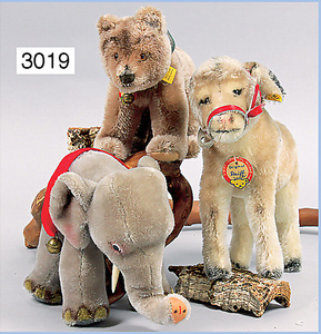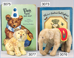 STEIFF Konv. 3 Teile, 1 Esel, komplett, Nr. 1322,00, 30 cm Länge, unbespielt, 1 Elefant, komplett, Nr. 6317,00, 15 cm, 1 Braunbär, auf 4 Pfoten, mit Knopf, Schild u. Fahne, Nr. 1317,02, 18 cm lang, schönes Konv., sehr guter Zust.