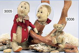 wohl STEIFF kl. Clown-Karikaturfigur, weiß/roter Filz, 18 cm, stark ausmodellierte Nase, sowie Kinn u. Hinterkopf, Drehkopf, bewegl. Arme, Füße erneut befestigt, neuer Kragen, min. Mohairverlust, außergewöhnliches Stück